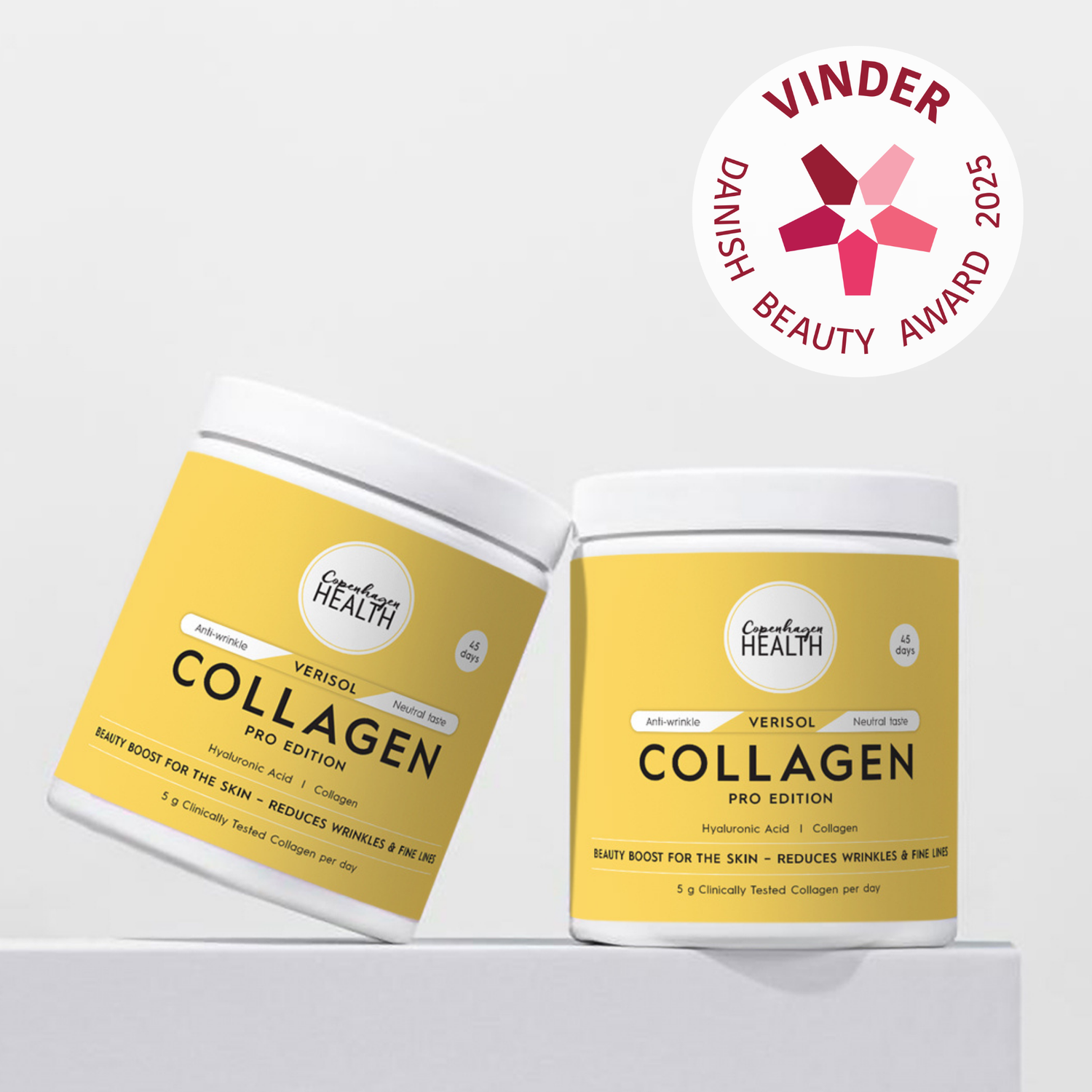 Om du söker ett helt smakneutralt alternativ är Verisol Collagen Pro Edition ett utmärkt val – detta bovina kollagenpulver är berikat med hyaluronsyra och är vinnare av Danish Beauty Award 2025 i kategorin Inner Beauty.