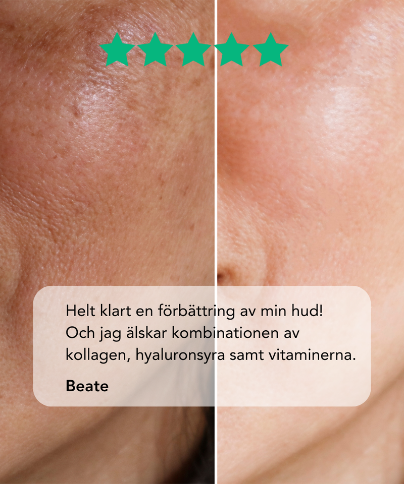 Dagligt intag av marint kollagenpulver har dokumenterad effekt på att minska rynkor och bidra till en slätare hud med mer lyster och färre rynkor.